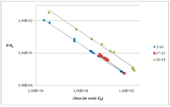 In Figure 3 the quantity (θ/θ0), obtained from the experimental data through (5) and (2), is plotted as a function of (Mc2/E0) in a doubly logarithmic scale. The representative points of the states 2–16, 17–25 and 26–34 are reported in three different colors and shapes (respectively diamonds, squares and triangles), in order to facilitate the distinction between families. The three fitting lines of the single families, Equation (3), are also reported. The reader can compare with Figure 2 and note the difference in correlation with the new variable.