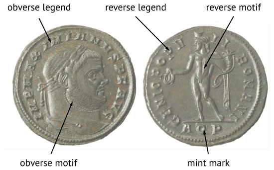 In the context of the present work, it is particularly important to note that all existing work in this area is inherently limited by the reliance on visual matching [2,11,12,13,14] and the assumption that the unknown query coin is one of a limited number of gallery types. However, this assumption is unrealistic as there are tens of thousands of different coin types [15] (Online Coins of the Roman Empire, a joint project of the American Numismatic Society and the Institute for the Study of the Ancient World at New York University, lists 43,000 published types). Hence, herein, our idea is to explore the possibility of understanding the artistic content depicted on a coin, which could then be used for subsequent text based matching, allowing access to a far greater number of coin types without requiring them to be represented in the training data. In short, our ultimate aim is to describe a coin in the same way that a human expert would—by identifying the individual semantic elements depicted thereon. We believe that this approach is hitherto unseen in the published literature and our work the first to attempt this task to date.