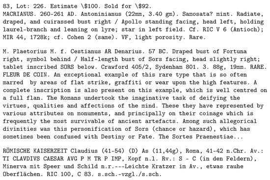 To facilitate the automatic extraction of salient semantic elements and the learning of their visual appearance, each coin image is associated with an unstructured text description of the coin, as provided by the professional dealer selling the coin; see Figure 3. The information provided in this textual meta-data varies substantially—invariably it includes the descriptions of the coin’s obverse and reverse, and the issuing authority (the person, usually emperor, on the obverse), but it may also feature catalogue references, minting date and place, provenance, etc.