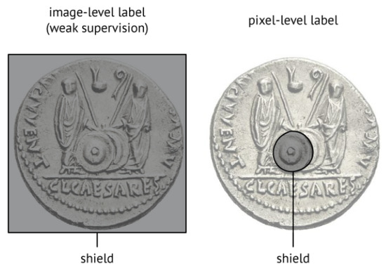 Recent pioneering work applying DCNNs to coin images has demonstrated extremely promising results, outperforming more traditional approaches by an order of magnitude [17]. A major difference in the nature of the challenge we tackle here is that our data set is weakly supervised—that is, samples are labelled only at the image level by a corresponding largely unstructured textual description, even though the actual semantic elements of interest themselves occupy a relative small area of the image. These kinds of data are much more abundant and easier to obtain than fully supervised data (pixel level labels) but pose a far greater challenge.
