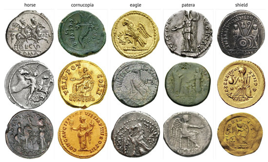 - Anwar, H.; Zambanini, S.; Kampel, M. Coarse-grained ancient coin classification using image-based reverse side motif recognition. Mach. Vis. Appl. 2015, 26, 295–304. [Google Scholar] [CrossRef]