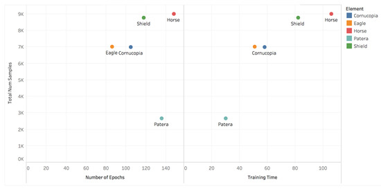 Figure 10 further demonstrates this—we can see that the visually simple patera is learned relatively quickly, while the more complex horse element which has much greater variability of depiction and is far more visually complex, quite reasonably takes much longer. The shield element is also somewhat costly to learn, likely due to the fact that it is depicted from a range of viewpoints—front-facing, sideways, on the ground, and carried in various positions which results in quite different visual appearances (see Figure 6).