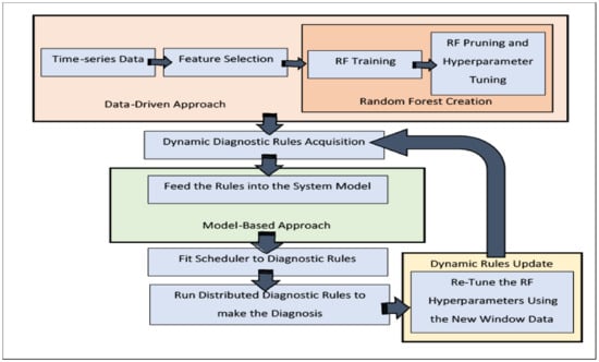 The proposed system scenario represents a possible method of merging random forest as a data-driven approach to industrial FDD and model-based FDD approaches into a final hybrid approach, which possesses the powerful features of both approaches. This technique eliminates the main drawbacks of each approach individually, such as the lack of dynamicity and responses to sudden occurrences, in the case of traditional model-based FDD. Additionally, it provides validated, accurate and dynamic diagnostic rules that contribute massively in reducing the required diagnostic time and computational resources, compared to their online data-driven counterparts. Figure 1 shows the two main diagnosis phases used in this research, data-driven and model-based, and how these two methods are combined into a new improved approach.
