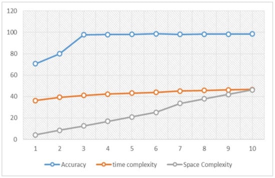 The following figure, Figure 2, shows how the time complexity and space complexity for the RF are directly proportional to the number of features used. It is crucial to emphasize that the amount of accuracy sacrificed, and the added complexity tolerances, are totally dependent on the system used and one’s preferences, i.e., some other researchers would use the highest three features with 0.977 accuracy, if they are willing to lose more accuracy as the cost for the dramatic drop in both time and space complexities.