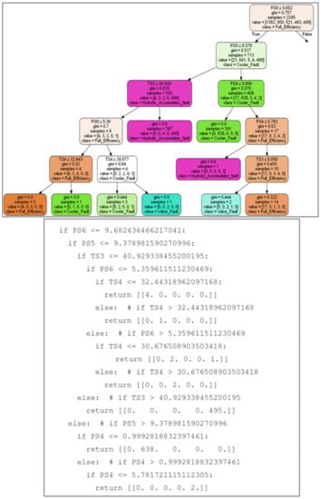 The data-driven part of this system is experimentally applied and analyzed using multivariate time-series sensor data collected from an actual hydraulic test rig. The applied data-driven part includes the RF creation, RF feature selection using non-zero feature importance, and RF pruning and hyperparameter tuning using three-fold cross validation on a grid of variables, selected using random search. Furthermore, the diagnostic rules in the form of nested if-else statements are practically extracted from RF as the diagnostic graph of this approach. The extracted rules can be converted into various forms and shapes depending on the nature of the system model that is the subject of integration.