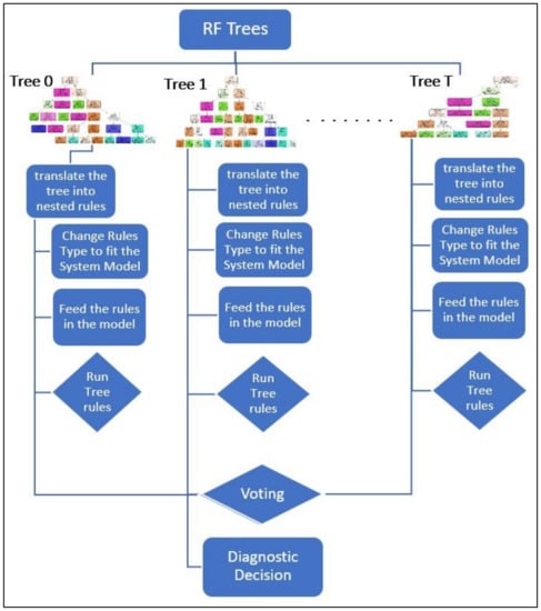 This phase represents a clear model of the system, whether it is an actual physical model, a simulation, a knowledge-base semantically connecting the system component together, or a relational database. Based on the system model’s nature, the extracted, nested, conditional rules from the random forest are transmitted to a suitable form, i.e., in knowledge-based systems such as ontologies the rules are converted into SPARQL semantic queries [], regular SQL queries in case the system model is represented by a relational database, or in a simpler fashion the direct application of the extracted rules as a small conditional code that can be executed every diagnostic window to perform the diagnosis. This phase is crucial to minimizing the online diagnostic time and computational power needed, compared to provoking the testing RF algorithm over and over for each sliding window. Moreover, it provides the possibility of introducing online distributed mechanisms given the rules and the graphs creating them.