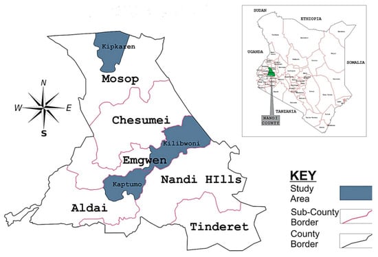 Nandi County is part of the former Rift Valley Province in Kenya, and covers an area of about 2900 km2 [3,22]. It lies between longitude 35°08′60.00″ E and latitude 0°10′0.00″ N [23] and is elevated between 1000 and 2000 m above sea level [3]. The area receives about 1000–1500 mm of rainfall on average, with a mean temperature of about 20 °C [3]. Kaptumo, Kilibwoni, and Kipkaren divisions in the county (Figure 1) were selected as study areas as these have been reported to be the areas where maize cultivation is actively practiced [3].
