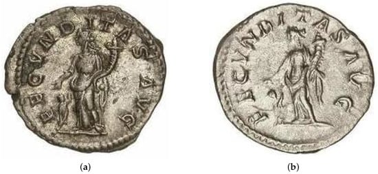 Reverses of two different specimens of the same issue—a silver (AR) denarius of Julia Maesa (RIC 249). Despite them being the same issue, the two specimens exhibit a series of appearance differences. These range from the arrangement of legend letters (e.g., note that the ‘I’ in ‘FECVNDITAS’ is to the left—as seen by a reader—of the goddess depicted on the specimen in (a) and to the right in (b)), the exact pose of the child next to the goddess (Fecunditas) or indeed the goddess herself, the flan shape and the centering of the motif within the flan, the damage and loss of fine detail, and the toning (‘color’ change).