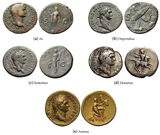 Firstly, the denominations, such as the dupondii, ases, and sestertii, featured rather large and heavy coins. Sestertii, for example, usually weigh between 25 and 28 g, and have a diameter of 32–34 mm. Being of lower value, these coins were also extensively used. For these reasons, they normally suffered significant damage, which makes it difficult to source a sufficient number of examples in different states of preservation. Moreover, the aforementioned denominations were all made of more reactive materials (copper alloys) and, as a result, experience color variability due to reactions with environmental agents (moisture, acids, etc.), thus possibly introducing undesirable confounding factors to the data. Lastly, the use of these denominations declined over time, limiting the range of motifs and styles to a specific period of the Empire, and thus potentially creating a bias in the data.
