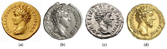 The legend on an ancient Roman imperial coin is an interesting semantic element. Some parts of it contain, in essence, the same information as the motif they encircle. For example, on the obverse, the legend almost invariably explicitly names the issuing authority shown on the coin—in Figure 4a, it begins with the ‘AVRELIVS’, which refers to Marcus Aurelius. Thus, this information can be used to aid in the process of issuing authority recognition or, with reference to the reverse, in the interpretation of the corresponding motif. However, the legend also contains some information which is generally not contained elsewhere. For example, the legend often contains the consular year of the issuing authority, such as ‘COS III’ (third consular year), which allows for the precise dating of the issue and its disambiguation from other issues otherwise identical to it.