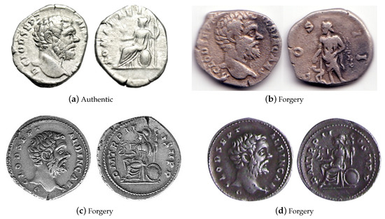 Considering the size of the global ancient coin market, it is hardly surprising that it is an attractive target for fraud. Unlike most other ancient artifacts (e.g., highly ornate pottery, helmets and other armor, swords, etc.), for the most part, ancient coins are medium-value collectables. This makes it cost-ineffective to individually authenticate all but a small number of more expensive specimens. Yet, the high volume of sales makes forgery a lucrative business. Despite this major practical significance, interestingly, the task of automatic forgery detection has not been explored in any published work to date. What makes this observation even more surprising is that the problem is technically quite interesting. In particular, the novel challenge lies in the new kind of intra-class variability within the class of forgeries. This variability emerges as a consequence of different methods used to produce fake coins. While a thorough discussion of this topic is beyond the scope of the present article, the simple example in Figure 5 will serve to illustrate the gist of it. Specifically, compare an authentic example of a silver denarius of Clodius Albinus in Figure 5a with the three forgeries in Figure 5b–d. The first of the latter, in Figure 5b, is good in style, and was likely produced from a casting mold, itself made from an authentic specimen (as a ‘negative’ thereof). The lack of authenticity is given away by the casting sprue at 10–11 o’clock looking at the obverse, the relief pattern around the legend (especially on the reverse; it is highly unlike that of struck coins), and the surface of the coin (impressions of small casting bubbles). In contrast, the forgeries in Figure 5b,c are poor in style, mostly likely made from modern molds, and readily recognizable as being produced by casting and not striking. How this wide inter-class variability can be learned is an open question and arguably makes the problem one of novelty detection.