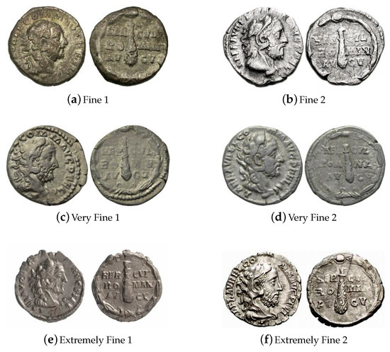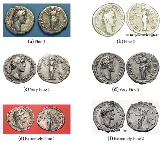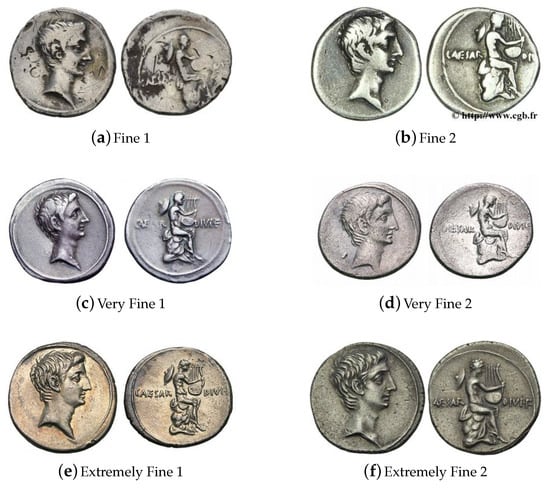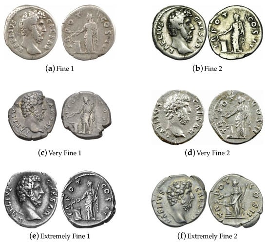 In Section 2.2, we summarized the common standard for grading ancient coins. It is important to note that the descriptions of different grades leave room for some subjectivity—hence, our use of the term ‘quasi-objective’. In the context of the present work, the practical significance of this observation lies in the potential difficulty of ensuring accuracy. To ensure that this goal is met, it is imperative that the grading is performed by an expert and that a sufficient number of graders are used so as to average out any potential biases. Thus, all of the data in our corpus are obtained from reputable dealers and auction houses, as are the accompanying labels. An attractive feature of this approach also lies in the self-regulating control of bias—any systematic bias (e.g., overestimation of the state of preservation) would end up being self-defeating, as it would reduce the incentive to purchase the bulk of the coins which are not of the top grade.