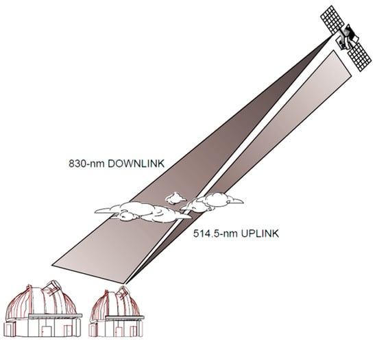 Satellite uplink and downlink with terrestrial stations from [8]: 0.6 m transmitter uplinking at 514.5 nanometers and 1.2 m receiver downlinking at 830 nanometers.