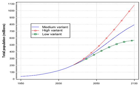 Presently, 55% of the world’s population lives in cities, and this percentage is estimated to increase to 68% in 2050 [20]. Similarly, the population of city residents worldwide is expected to increase by 2.5 billion by 2050. The anticipated population increase will occur in developing nations, with an almost 90% increase in Asia and Africa [20]. Nigeria has a population of over 200 million [21], which makes it the most populous country in Africa [22]. It is predicted that by 2050, Nigeria will be the third most populated country in the world, with an estimated population of over 398 million [20]. Urbanization in Nigeria began over one hundred years ago according to Mabogunje [23]. Prior to Nigeria’s independence in 1960, the urban population growth was extremely low [24]; after 1960, only the cities of Lagos and Ibadan had populations higher than half a million people each, while almost a hundred thousand people resided in the remaining twenty-four cities across the country [24,25]. However, an incomparably high level of urbanization happened between 1970 and 1995, supposedly the fastest global urbanization growth rate at that period [26]. This population increase was ascribed to the 1970s and 1980s crude oil boom with resultant development projects across the country, as well as the influx of people to the cities [24]. Figure 1 shows the total population of Nigeria by variant.