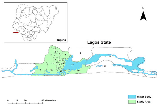 Lagos is the area of study. It was the administrative capital of Nigeria until 1991, when the headquarters was relocated to the federal capital territory (FCT) in Abuja [61]. Metropolitan Lagos is typified by a quite flat terrain and coastal depositional features: Wetlands, beaches, and estuaries [55]. With an estimated population of over 14 million [27], Lagos is the largest city in Nigeria. Lagos State covers an area of approximately 3671 square kilometers (1,443.98 square miles) [62]. It is in the southwestern part of the country and situated on longitude 2°42′–4°20′ East and latitude 6°22′–6°42′ North. Additionally, it is bordered by the Republic of Benin in the West, with Ogun State in the North and East, as well as the Atlantic Ocean in the South [63]. The high-density metropolitan region of Lagos where this study was conducted comprises sixteen Local Government Areas (LGAs) identified with numbers: (1) Agege; (2) Ifako-Ijaye; (3) Alimosho; (4) Ikeja; (5) Shomolu; (6) Kosofe; (9) Oshodi-Isolo; (10) Mushin; (12) Ojo; (13) Amuwo Odofin; (14) Ajeromi Ifelodun; (15) Surulere; (16) Lagos Mainland; (17) Lagos Island; (18) Apapa; and (19) Eti Osa. The four rural LGAs: (7) Ikorodu; (8) Epe; (11) Badagry; and (20) Ibeju Lekki, were not studied (see Figure 2).