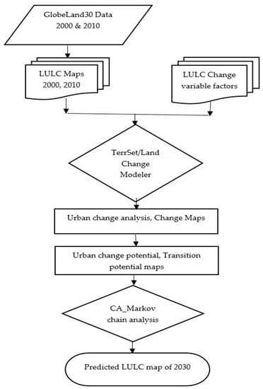Figure 3 shows the study flowchart and procedures that were carried out. These include the GlobeLand30 data 2000 and 2010, the formation of LULC maps, choice of variables, change analysis, transition potential modeling and prediction employing LCM and CA Markov chain techniques.