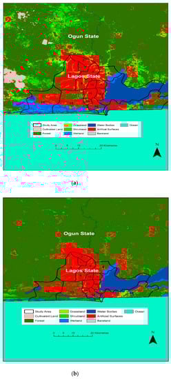 Regarding LULC distribution, the results show that the development of artificial surfaces occurred within and outside the frontier of Lagos State, and extended to bordering Ogun State (see Figure 4a,b). This report corroborates a research outcome which stated that approximately 50% of the growth of artificial surfaces in Lagos metropolitan region happened outside the administrative frontier of Lagos and extended to nearby areas in Ogun State [108]. Similarly, the Federal Government of Nigeria [109] reported the quick growth (i.e., incessant development of artificial surfaces) in metropolitan Lagos and its attainment of Megacity status with an extent of over 153,540 hectares of land consisting of adjourning Ado-Odo/Ota, Ifo, Obafemi-Owode, and Sagamu LGAs of Ogun State. Moreover, research by Braimoh and Onishi [55] found that rising demand for urban land in Lagos is being met by converting rural land at the fringe of existing artificial surfaces.