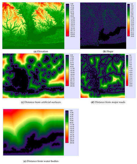 Standardized factors (variables) used in the study: (a) Elevation, (b) slope, (c) distance from artificial surfaces, (d) distance from major roads, and (e) distance from water bodies.