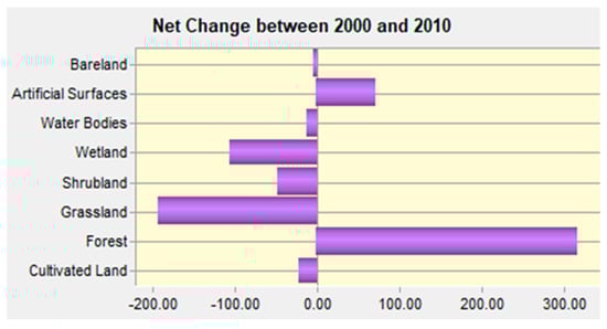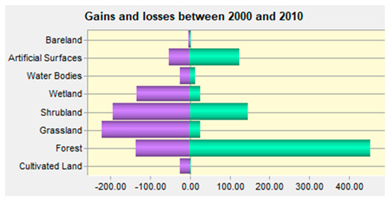 The results clearly show that between 2000 and 2010, forest experienced significant gains and losses, with 455.45 km2 gains and 137.11 km2 losses, as well as a substantial net gain of 318.34 km2, which was the highest among the land cover types. Additionally, artificial surfaces increased with a gain of 125.52 km2, a loss of 53.08 km2, and a net gain of 72.44 km2. Moreover, cultivated land, grassland, shrubland, wetland, water bodies, and bare land all presented negative net changes. Grassland showed the greatest negative net change of 194.36 km2; it lost about 221.98 km2 and gained 27.62 km2; shrubland lost 194.80 km2, gained 146.25 km2, and showed a net loss of 48.55 km2; wetland lost 134.56 km2; it gained 27.43 km2, and displayed large net loss of 107.14 km2. Water bodies showed 25.51 km2 loss, 12.14 km2 gain, and a net loss of 13.36 km2. In addition, cultivated land lost 24.21 km2, gained 1.12 km2, and demonstrated a net loss of 23.09 km2.