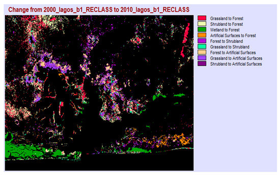In summary, it is evident from the findings within the period of the study that: (1) The extents of forest and artificial surfaces in terms of gains and net changes were substantial; (2) there was substantial loss of vegetation (i.e., grassland and shrubland) and shrinkage of wetland; and (3) bare land with zero gains seemed not to show any appreciable impact of change in comparison with other land cover types. Findings concerning artificial surfaces and bare land concur with Arsanjani [107], who proposed that bare land can show a negative land change, whereas development of artificial surfaces, e.g., greenspaces, might display a positive change based on local conditions. This implies that Arsanjani’s report is applicable to the situation in the Lagos metropolitan region.