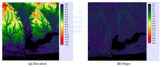 LULC changes are naturally associated with elevation and slope [110]. This study revealed that most of the LULC change in Lagos metropolitan region occurred with elevation of between 0–83.75m (small effects of elevation) (Figure 9a). Therefore, the extent of elevation in Lagos is low. Additionally, zones with higher elevation are more suitable for settlement, whereas zones with low elevations are not easily accessible for settlement and agriculture [111]. Findings show that slope occurred between 0–10 degrees in most parts of the Lagos metropolitan region (Figure 9b), implying that slope correlated with less impact on the growth of the zone. This might be due to the flat terrain in Lagos having slope constraints that are not significant [108]. Flat topography, in contrast to hilly zones, could be cost-effective for environmental and city planners in the built environment in Lagos State. Additionally, the influence of elevation and slope may decline in the future because of technological developments and consequent reductions in the cost of construction in hilly sites [89,112]. Cognizance of the impacts of elevation and slope on LULC is crucial to the efficient planning and implementation of policies that enhance sustainable natural resource management [113].