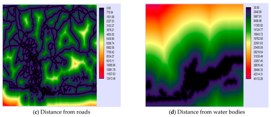 There is no general recommendation for selecting the driving forces for LULC changes. However, selection was made especially for each study area based on the uniqueness of each region concerning the driving factors that affect its urban growth [83]. Thus, the appropriateness of different factors could differ from one study to another [84,85]. Constraints are measures that can restrict the development of artificial surfaces. A constraint is specified like the Boolean map, and it signifies that a value of 0 (not suitable) is apportioned to the areas (i.e., LULC types) that are excluded, while areas included are apportioned a value of 1 (suitable) [86]. This study conceived water bodies and existing artificial surfaces as constraints. Thus, the factors and constraints were standardized in the TerrSet software. In this analysis, a 0–255 scale was used to standardize the factors (see Figure 5 for standardized factors/variables).