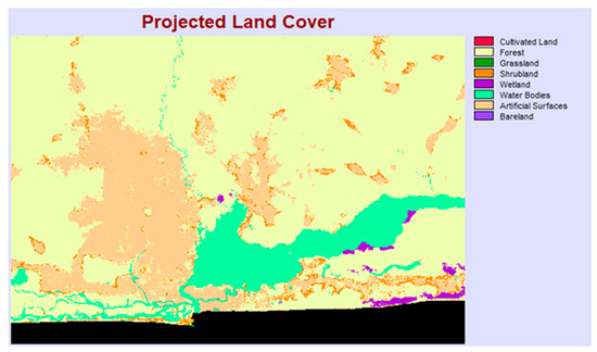 Accordingly, decrease in forest size and quality constitute environmental threats to the well-being of communities residing in the vicinity of forests [118]. Artificial surfaces were also predicted to have large spatial extent of 19.19% with continuous decrease in the quantities of water bodies (9.3%), shrubland (2.44%), and wetland (0.76%), including steady declines in the amounts of the cultivated land and grassland.