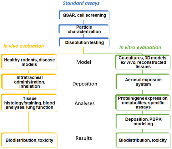 Workflow in the testing of inhaled substances. Common techniques in the testing are shown in blue, in vivo testing methods in yellow, and alternative testing methods (in silico and cellular models) in green boxes.