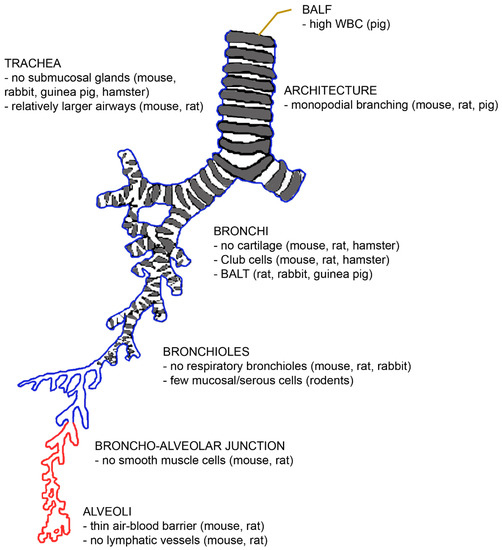 The architecture of the bronchial tree with an indication of differences with the human situation. Abbreviations: BALF, bronchoalveolar lavage fluid; BALT, bronchus-associated lymphatic tissue; WBC, white blood count.