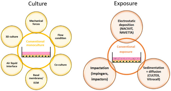 Adaptations in cell culture (yellow) and exposure (brown) that result in physiologically more relevant in vitro models. Abbreviation: ECM, extracellular matrix.