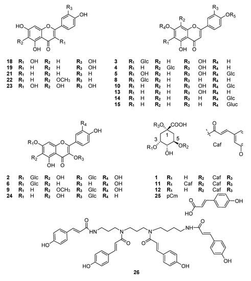 The organic phases B and C of M. pubescens were subjected to classical phytochemical fractionations as follows: Organic phase B (EtOAc, 5.10 g) was subjected to vacuum liquid chromatography (10 cm × 6.5 cm) over silica gel (Merck 1511) with mixtures of solvents of increasing polarity, petroleum ether (PE), EtOAc and acetone (Ac), and produced 11 fractions (MPB-A to MPB-K). Fraction MPB-D (487.5 mg, eluted with PE:EtOAc 25:75) was subjected to Sephadex LH-20 with DM:MeOH 50:50 and yielded ten fractions (MPB-DA to MPB-DK). Part (18.9 mg) of fraction MPB-DI was subjected to RP-HPLC with MeOH:H2O 60:40 and produced pure apigenin (21) (2.1 mg) and luteolin (19) (2.6 mg). Fraction MPB-E (355.8 mg, eluted with EtOAc 100%, was subjected to Sephadex LH-20 with DM:MeOH 50:50 and yielded quercetin (18) (4.5 mg). Fraction MPB-Ε (355.8 mg, eluted with EtOAc 100%) was fractionated over non-polar Sephadex LH-20 with DM:MeOH 1:1 and yielded a mixture of apigenin (21), luteolin (19) and p-coumaric acid (25), as well as a mixture of quercetin (18) and quercetagetin (23). Fraction MPB-F (353.8 mg, eluted with EtOAc:Ac 90:10) was fractionated over non-polar Sephadex LH-20 with PE:DM:MeOH (from 5:3:1 to 3:3:1) and yielded impure hispidulin, which was further purified by RP-HPLC with MeOH:H2O 1:1 to give pure hispidulin (22) (0.6 mg). Fraction MPB-H (339.3 mg, eluted with EtOAc:Ac 75:25) was fractionated over Sephadex LH-20 with MeOH 100% and yielded 3,5-O-dicaffeoylquinic acid (11) (10.9 mg) and 1,5-O-dicaffeoylquinic acid (12) (34.4 mg). M. pubescens organic phase C (BuOH, 2.2 g) was initially partitioned with DM to eliminate non-polar constituents, and the aqueous phase (2.0 g) was subjected to Sephadex LH-20 with MeOH 90%; it yielded 21 subfractions (ALG-CA to ALG-CU). Subfraction ALG-CS (6.4 mg) was identified as luteolin-4′-O-glucoside by NMR (13). Subfraction ALG-CK (15.0 mg) was subjected to preparative RPC18-HPLC (MeOH 50%) and produced polyamine 26 (N1(E)-N5(E)-N9(E)-N14(E)-tetra-trans-p-coumaroyl thermospermine, 5.5 mg). Subfractions ALG-CL (33.5 mg), ALG-CP (8.4 mg) and ALG-CQ (12.9 mg) were studied as such by a combination of HPLC–PDA–MS and NMR. In subfraction ALG-CL (33.5 mg), the presence of apigenin-7-O-glucopyranoside (14) and isoorientin (3, luteolin-6-C-glucopyranoside) was confirmed. Subfraction ALG-CQ was identified as a mixture of mainly luteolin-4′-O-glucoside (13) and quercetagenin-3-O-glucoside (2), and also contained traces of apigenin (21), hispidulin (22), quercetin-7-O-glucoside (6) and 6-hydroxykaempferol-3-O-hexoside (24). In ALG-CP (8.4 mg), the presence of luteolin-7-O-glucoside (10) and 6-hydroxyluteolin-7-O-glucoside (5) was confirmed by NMR and MS (Table 1, Figure 1 and Figure S10, Table S3 of Supplementary Material).