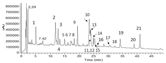 Figure 2. Representative HPLC–PDA–MS chromatogram of the MeOH extract of Matricaria pubescens flowers. Experimental conditions: column: Zorbax SbAq RP-C18 (150 × 3.0 mm), particle size of 5 µm (Agilent) at 30 °C. Compounds detected: chlorogenic acid (1), quercetagenin-3-O-glucoside (2), isoorientin (3), orientin (4), 6-hydroxyluteolin-7-O-glucoside (5), quercetin-7-O-glucoside (6), 6/8-hydroxyluteolin-4′-O-glucoside (7), isovitexin (8), patuletin-3-O-glucoside (9), luteolin-7-O-glucoside (10), 3,5-O-dicaffeoylquinic acid (11), eluted together with 1,5-O-dicaffeoylquinic acid (12), luteolin-4′-O-glucoside (13), apigenin-7-O-glucoside (14), apigenin-7-O-glucuronide (15), caffeic acid derivative (16), tri-p-coumaroyl derivative of spermine/thermospermine (17), quercetin (18), luteolin (19), polyamine derivative (20), and apigenin (21).