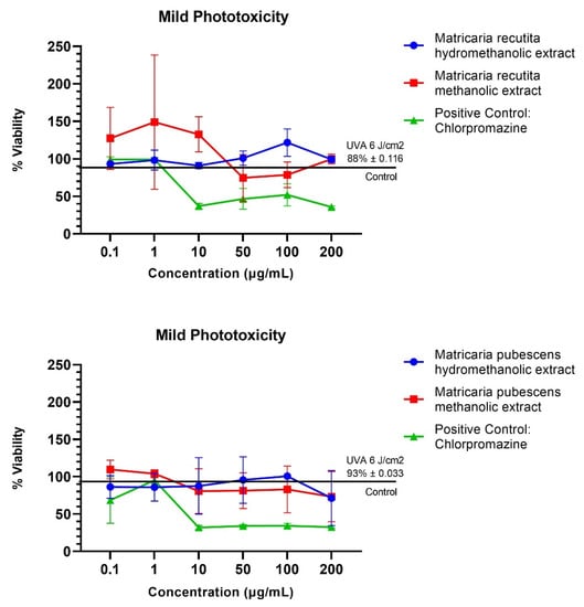 The possible protective role against cell-induced necrosis of methanolic and hydromethanolic extracts of the two chamomile species (M. pubescens and M. recutita) was tested in vitro. Both extracts were dried prior to use. More specifically, using BALbC 3T3 mouse skin fibroblasts (ATCC cell line) and UVA irradiation (6 J/cm2), the effect of the two chamomile species was studied in a mild UVA-induced phototoxicity test. The selected UVA dose was slightly cytotoxic for the specific cell line, in order to reveal the possible cytoprotective efficacy of the extracts. The irradiance was adjusted to reach 6 J/cm2 within a time period of 60 min. The chamomile extracts were incorporated both in the culture medium (DMEM/2d) and in the irradiation phosphate buffer saline (PBS) solution. Six concentrations of the chamomile extracts were tested, covering a broad spectrum (0.1, 1, 10, 50, 100 and 200 μg/mL). Cells incubated with DMEM medium served as a control, and positive control cells incubated with Chlorpromazine hydrochloride were used as a positive control at the same concentrations as the extracts (0.1–200 μg/mL). Cell viability was evaluated by neutral red absorption (540 nm) (Supplementary Material–In vitro protective activity on BALbC 3T3 mouse skin fibroblasts).