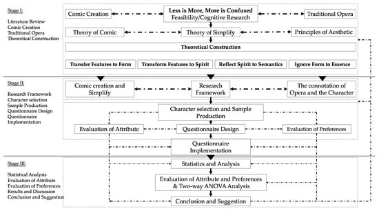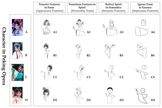 The process was divided into three stages, as illustrated in Figure 4. The first step focuses on literature, including the creation of cartoons, the characteristics of traditional opera, and the theory of communication. Based on the concepts and theories above, a creative theory consisting of the following four characteristics is built: (1) “Transfer Features to Form”, (2) “Transform Features to Spirit”, (3) “Reflect Spirit to Semantics”, and (4) “Ignore Form to Essence”.