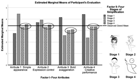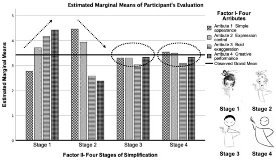 - It can be seen from Figure 7 and Figure 8 that (1) Between the images of the first two stages of simplification, except for the similar evaluation on the second attribute, there are big differences in the other three attributes. Nevertheless, the two images have a certain point of continuity, no matter how they are expressed or simplified, which is why such a large difference in cognition is worthy of further study. (2) The images of the last two stages of simplification have very similar evaluations on all attributes, and there is not much fluctuation. In terms of details, the score of stage 4’s image is comparatively high. The above results can explained: In terms of the “simplification” itself, the perception that participants have of the simplified image is relatively stable. However, they do not like images that are too simplified (close to symbols). This is in agreement with the results in Table 5.