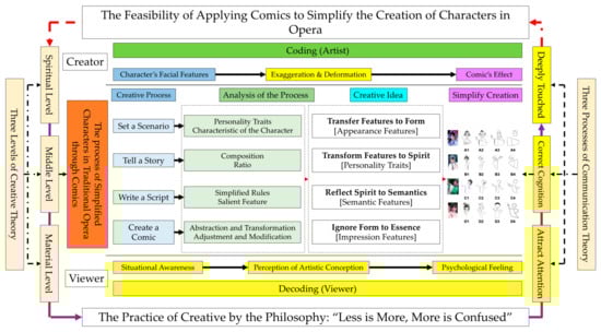 The study of communication involves three levels of problems: technical, semantic, and effective. The technological level demands that the spectator attractions are recognized by their senses. The semantic level requires that the spectator accurately realizes the sense of the message through its realization. The level of efficiency refers to the ways in which the spectator is brought to take moral reflection through his/her knowledge [,,,,]. Starting with the image formation of the opera and using comics to express the shape and spirit of the characters, Lin [] proposed the four steps of the creative process: (1) set a scenario, (2) tell a story, (3) write a script, and (4) create a comic—which extends the comic creation process of opera elements into a unique creative model called “Ignore Form to Essence”. Analysis of the practice of comic creation to achieve the purpose of “Reflect Spirit to Semantics”, in order to establish a research framework for the comic creation of simplified opera, is shown in Figure 3.