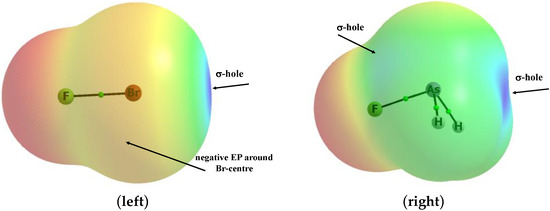 The complexes connected by halogen, chalcogen, pnicogen, and tetrel bonds, where the Cl− anion acts as the Lewis base, are analysed. The FCl and FBr electron acceptors form complexes with the latter anion by the halogen bond; the SFH and SeFH species form complexes through the chalcogen bond; similarly, the pnicogen bond links the chloride anion with the PFH2 and AsFH2 moieties, while the tetrel bond connects the SiFH3 and GeFH3 species with the Cl− anion. In the complexes analysed here, the Z centre (Z = Cl, Br, S, Se, As, P, Si, or Ge) of the Lewis acid unit is connected to the chloride anion through the σ-hole. The latter is situated approximately at the Z-centre, in the extension of the F–Z bond. There are also σ-holes located in elongations of the H–Z bonds; however, the contacts with them are not analysed here. The above-mentioned σ-holes are characterized by the depletion of the electron charge and the positive electrostatic potential (EP); four σ-holes are observed for the Ge and Si centres, three for As and P, two for S and Se, and one for Br and Cl. Figure 1 shows two examples of EP mapped at the molecular surfaces of the AsFH2 and FBr moieties; the σ-holes are shown there. The species containing fluorine substituents were chosen as the Lewis acid units, since the fluorine, as the electron-withdrawing substituent, enhances the σ-hole (positive EP increases) at the Z-centre in the extension of the F–Z bond. In the case of the FBr species, there is one σ-hole at the bromine centre located in the elongation of the F–Br bond, while, for the AsFH2 moiety, there are three σ-holes at the arsenic centre; the strongest one is characterised by the greatest positive EP in the extension of the F–As bond and two in extensions of the H–As bonds (only one of them is visible in Figure 1).