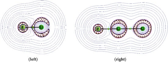 Figure 2 presents the 2D maps of the Laplacian of electron density, ∇2ρ, for the FCl species and for the FCl∙∙∙Cl− complex. One can see here the positive ∇2ρ value in the extension of the F–Cl bond for the isolated FCl unit that corresponds to the σ-hole. The complexation is connected to the electron charge shifts from the chloride anion to the FCl unit that leads to the accumulation of the electron charge between the Cl centres; both chlorine centres in the complex are surrounded by areas of negative ∇2ρ values.