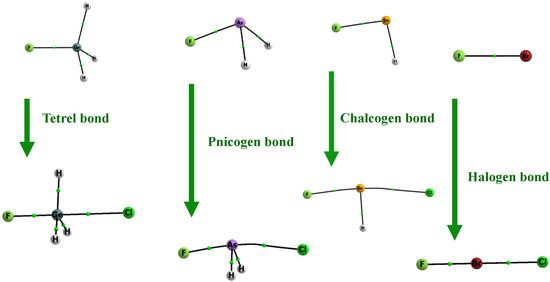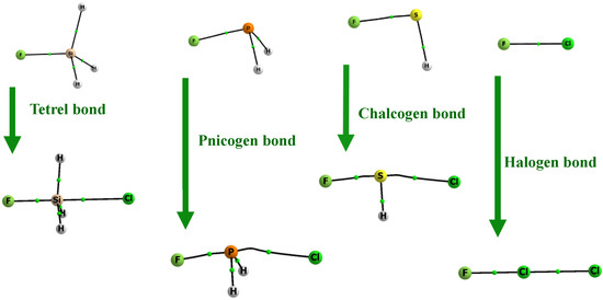 The Quantum Theory of Atoms in Molecules [56,57], QTAIM, is applied here to indicate the interactions between centres in the species analysed in this study. Figure 3 and Figure 4 present molecular graphs of the species that act as the Lewis acid units and the molecular graphs of their corresponding complexes with the chloride anion. There are links between the Z-centre (halogen, chalcogen, pnicogen, or tetrel) and the chloride anion in these systems. The bond paths with bond critical points (BCPs), which are presented in the figures, correspond to the above-mentioned links; this is evidence of the stabilizing interactions in complexes analysed here [58,59]. The Z-centre is linked to the chlorine one through its σ-hole located in the elongation of the F–Z bond. The links through the σ-holes located in the extension of the H–Z bonds are not considered, since the EP positive values are lower here than those for the corresponding F–Z σ-holes. The aim of this study is to discuss the very strong interactions, and the links through the σ-holes enhanced by the F-substituent guarantee them. The molecular graphs in Figure 3 and Figure 4 correspond to Scheme 2. They also present the changes in the tetrahedral configurations of the Z-centres into trigonal bipyramid ones. These figures do not show the localizations of lone electron pairs, however. This is why, only in the case of the tetrel bonded complexes, SiFH3∙∙∙Cl− and GeFH3∙∙∙Cl−, the trigonal bipyramid structures are expressed clearly by the molecular graphs; there are no lone electron pairs in tetrel centres here.