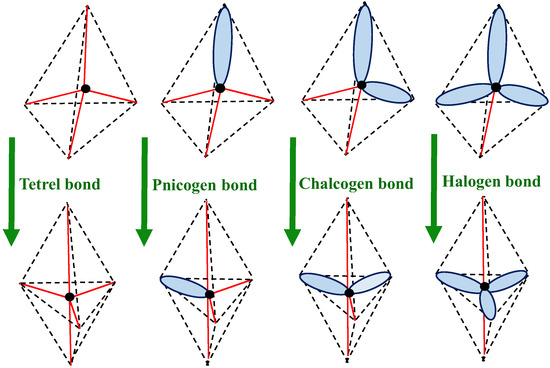 Changes in the tetrahedral configuration into the trigonal bipyramid resulting from the formation of tetrel, pnicogen, chalcogen, and halogen bonds. Red lines correspond schematically to covalent bonds (or strong interactions), while blue ellipsoids correspond to lone electron pairs.
