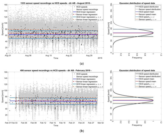 HCD speed samples’ distributions: (a) close to the control unit 1333, AB direction, August 2018; (b) close to the control unit 490, AB direction, February 2019.