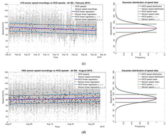 Firstly, the HCD close to the measurement stations have been identified and selected; then, as shown in Figure 4, the speed data extracted from the two different sources have been overlapped in the same graph as a function of time. In Figure 4, the representation of the Gaussian distributions of the two different data samples is flanked (on the right side) by the speed-time graph (on the left side).