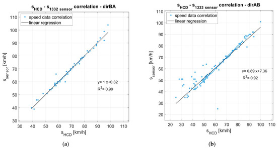 As shown in Figure 5, the reliability assessment was performed considering the linear regression between the speed data from the two different data sources, and the following observations are carried out: