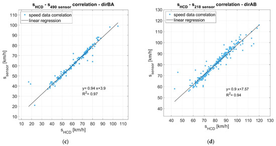 HCD and sensors’ speeds’ samples correlation: (a) Control unit 1332, BA direction; (b) Control unit 1333, AB direction; (c) Control unit 490, BA direction; (d) Control unit 218, BA direction.