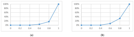 Cumulative percentage diagram of the obtained values of the coefficients of determination R2: (a) Percentage distribution of the coefficients of determination R2 for the whole sample of analyzed data, evaluated for the driving direction AB; (b) Percentage distribution of the obtained values of the coefficients of determination R2 for the whole sample of analyzed data, evaluated for the driving direction BA.