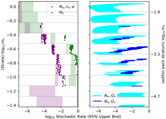 Incidence rate of models with slow roll starting below the peak and no stochastic inflation, among models in Measure A with 70+ e-folds. Each data point represents one batch of simulations with particular (only showing batches with at least one positive event per sample). All models within a vertical stratum have the same value of (the center of the stratum on the left axis); vertical position within the stratum reflects (range shown on the right axis). Data points reflect 95% confidence upper bounds. In the left plot, green data points are derived from samples conditioned on and ; purple data points are conditioned only on minimal e-folds; the shaded bars indicate 90% confidence intervals taking models from all values of as belonging to one sample. In the right plot, the blue lines show 90% confidence intervals derived from samples of successful models conditioned further on . Darker lines reflect samples that have at least one non-stochastic model in the sample, whereas lighter points are determined only by sample size.