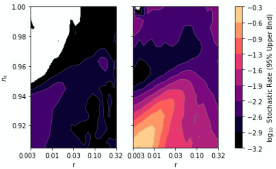 Marginal distributions of spectral parameters in Measures A (left) and B (right). Foreground (magma): 95% confidence upper bound on the rate of incidence of falling within Planck 2018 68% confidence interval. The vertical striation pattern emerging on the left-hand side reflects the shortage of samples with successful inflation at low – due to slower accrual of e-folds and the second slow roll criterion not being met at the peak – resulting in a weaker bound. Background: rates of incidence of (blue, upper) and r (green, lower) falling within Planck’s 68% confidence intervals, with higher color saturation (darker gray) indicating a higher rate.