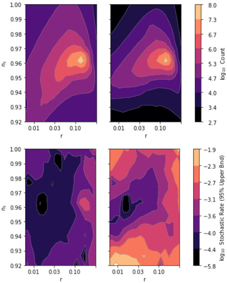 in an interval where , then the full equation of motion exhibits an attractor behavior leading quickly to the slow roll profile Equation (11) [23]. Sampling from a distribution and then conditioning on slow roll, the population of surviving models would be those that approximate the above measures, with additional weighting like . Since we are drawing from an array of mass scales, we could model such effects from our simulated data without running the full dynamics, by adjusting the prior on . (Our results presented below do not take into account such a reweighting.)