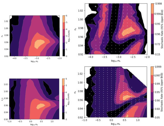Figure A4 depicts the 95% confidence upper bounds on marginal rates of incidence for parameters describing the CMB power spectrum falling within Planck 2018 68% confidence intervals, calculated by the procedure described in Appendix A.3. Attending to the super-Planckian regime : note the positive correlation of mass scales along tightly spaced contours defining equal rates of incidence for matching of the scalar amplitude . With going like , one might expect that correlation to be negative—why the inversion? Since we select for potentials with a small vacuum energy in the final basin and then shift to zero, inflation always ends. At this scale inflation almost always ends very close to the minimum, where the potential is approximately quadratic and perturbation spectral parameters take their familiar forms for . In this regime, we more efficiently retain small fluctuations as increases by delaying the end of inflation—drawing the horizon exit scale closer to the minimum where