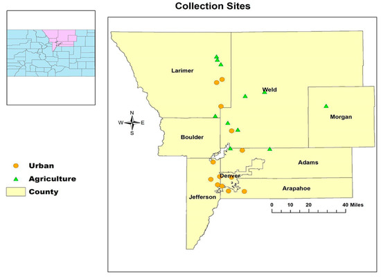 Sampling sites were selected based on how urban and agricultural areas are classified. According to the United States Census Bureau, urban areas are defined as continuously built-up areas with populations of 2500–50,000 or more and average densities of at least 1000 inhabitants per square mile [37], while the Colorado General Assembly defines agricultural land as “A parcel of land, whether located in an incorporated or unincorporated area and was used the previous two years and presently is used as a farm or ranch” [38]. We had to identify the landscape type using Google Earth, taking into consideration the observation that honey bees can fly for more than 3 km when searching for food [39].